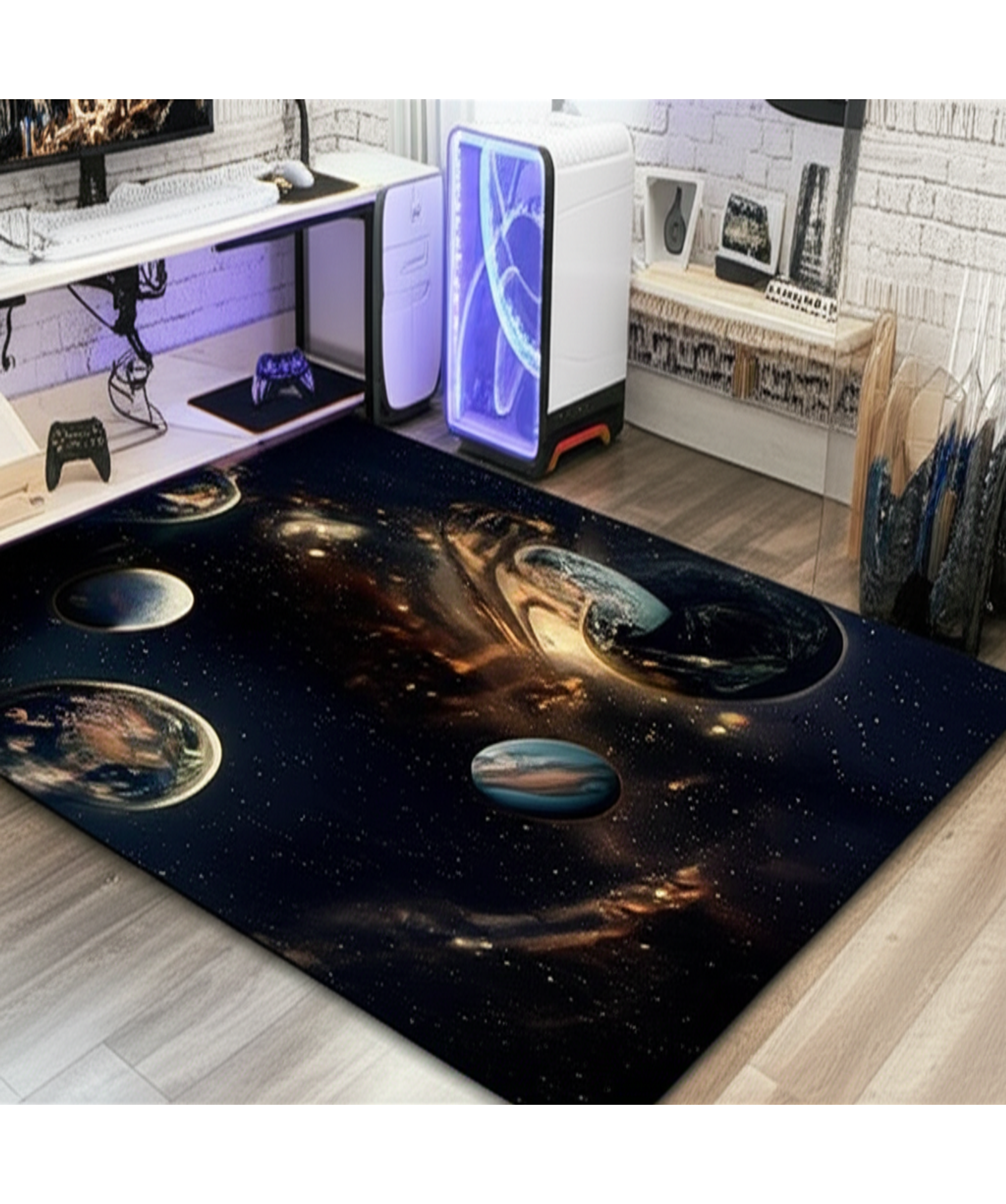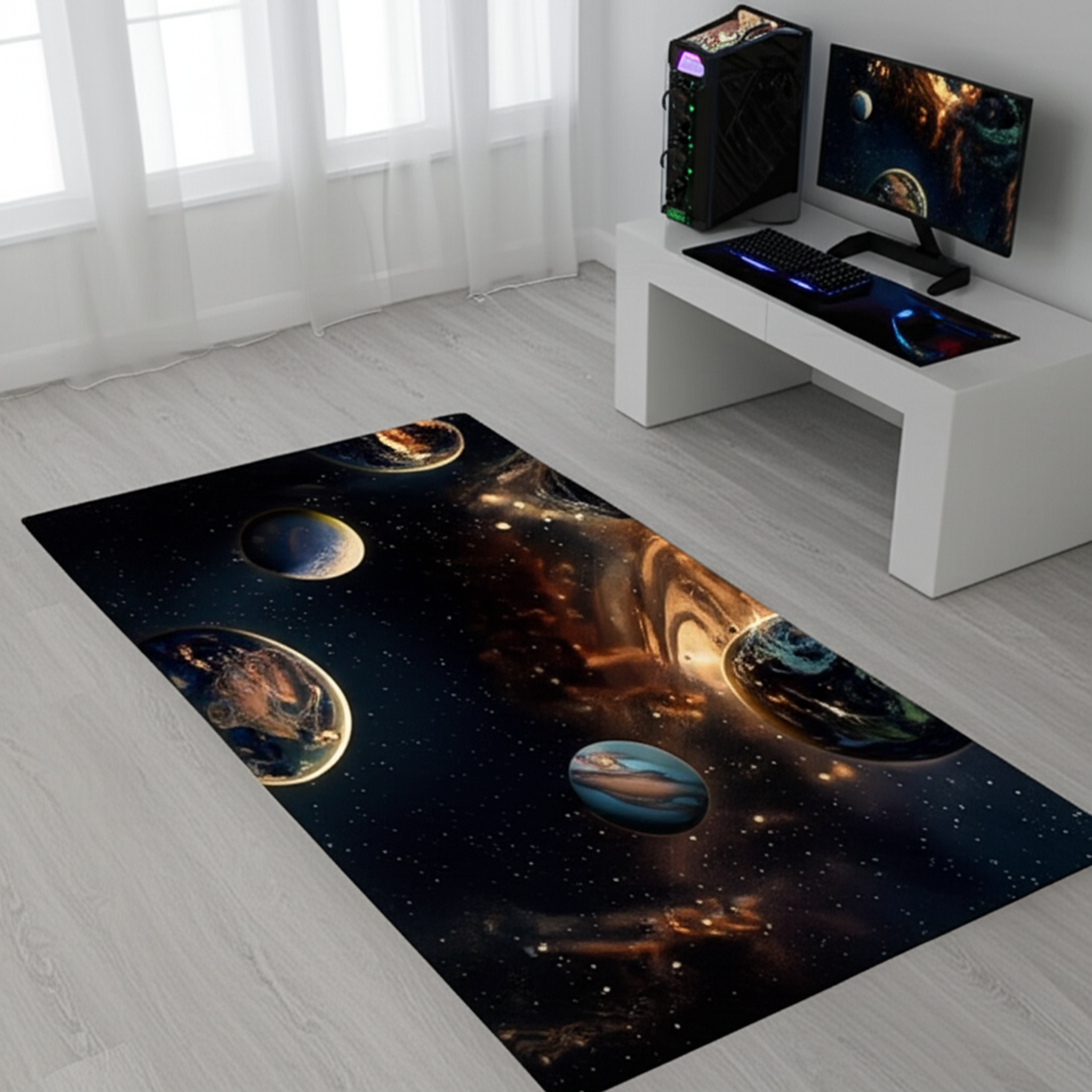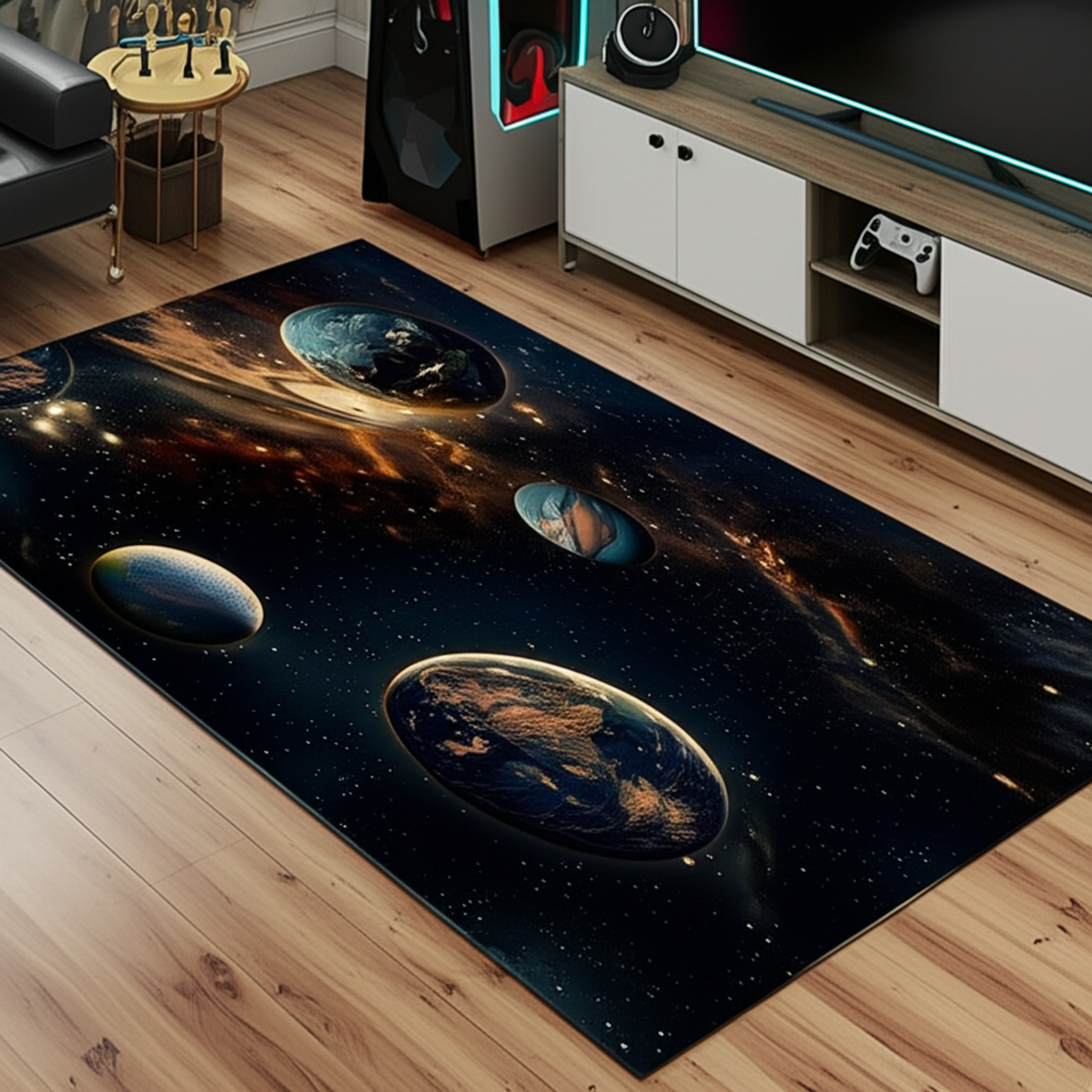This rug features a gorgeous design of planets and stars. The cosmic scene will add a touch of wonder to any room. The dark background with golden accents makes the planets stand out.