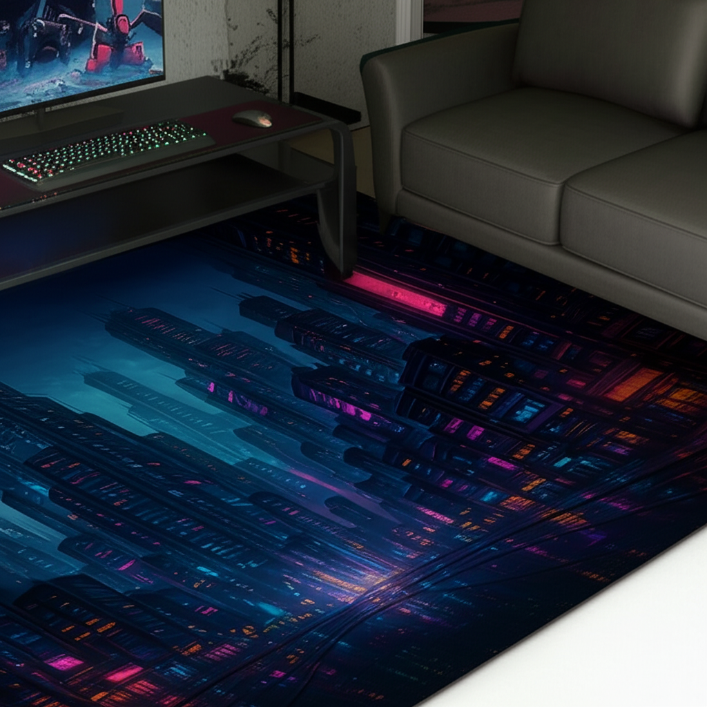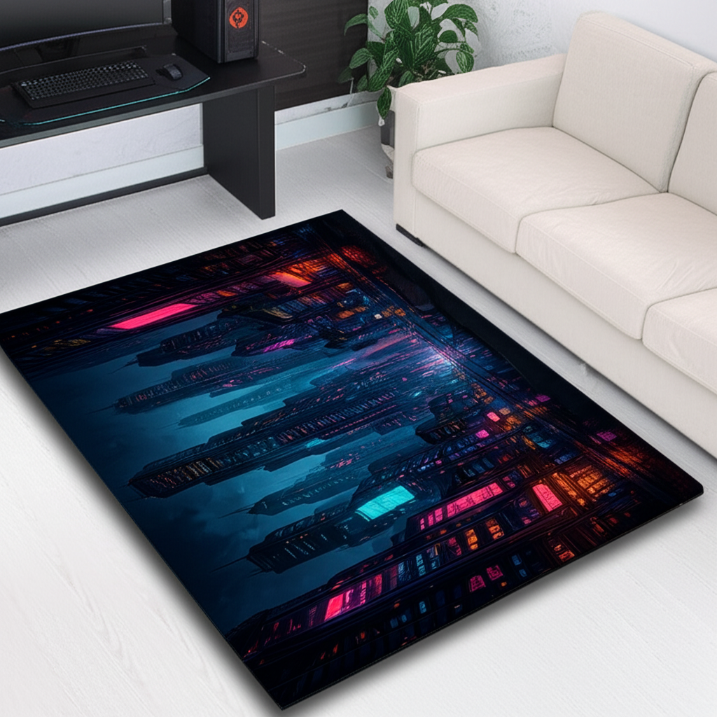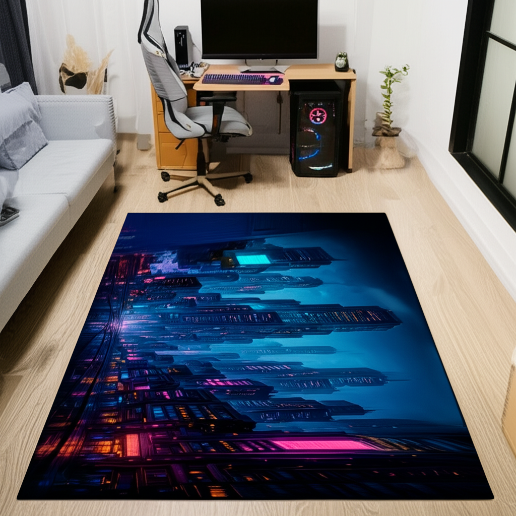 Elevate your gaming sanctuary with this stunning Cyberpunk City Rug! This modern rug showcases a vibrant, futuristic cityscape with neon lights and intricate details, creating an immersive atmosphere in any room. Perfect for gaming setups, home offices, or adding an edgy touch to your living space, this rug is sure to impress. Imagine sinking into your gaming chair, surrounded by the glow of your setup and the soft touch of this rug under your feet, totally immersed in your virtual world. It's the perfect gift for gamers, sci-fi enthusiasts, or anyone who appreciates unique and modern decor. It's not just a rug; it's a statement piece!