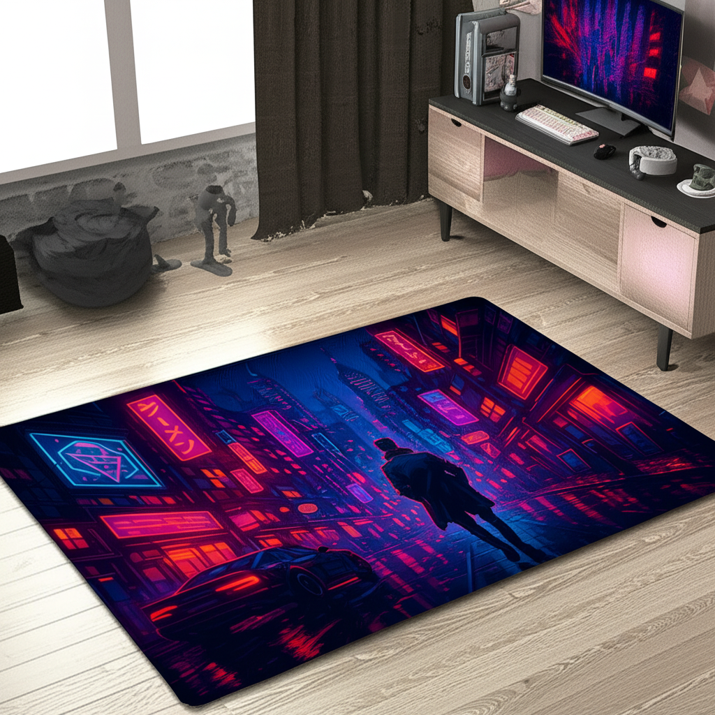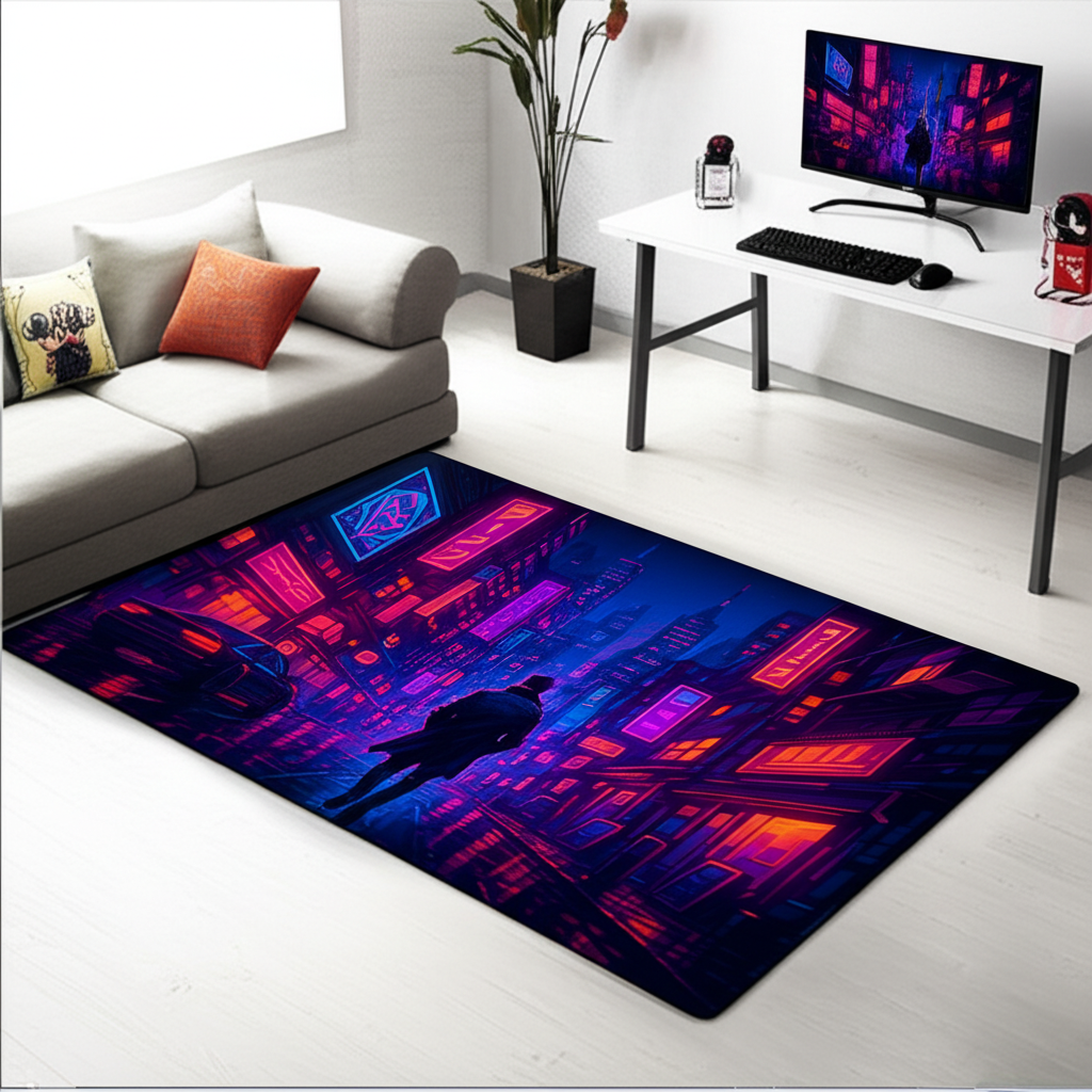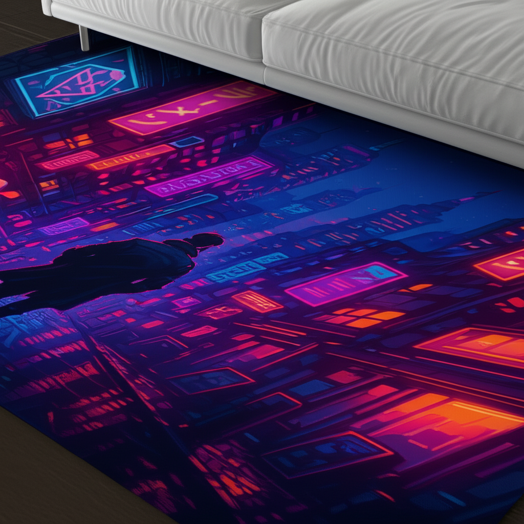 Immerse yourself in a vibrant, futuristic world with this stunning Cyberpunk Cityscape Premium Rug. Perfect for adding a touch of edgy style to any room, this rug features a detailed design of a neon-lit cityscape with its buildings and unique lighting, inspired by the cyberpunk aesthetic. The dark silhouette of a character adds mystery and depth, making it a captivating focal point. Ideal for gaming rooms, living spaces, or bedrooms, this rug brings an urban, tech-inspired vibe to your decor. It's a great gift for gamers, sci-fi enthusiasts, or anyone who appreciates unique and bold design.