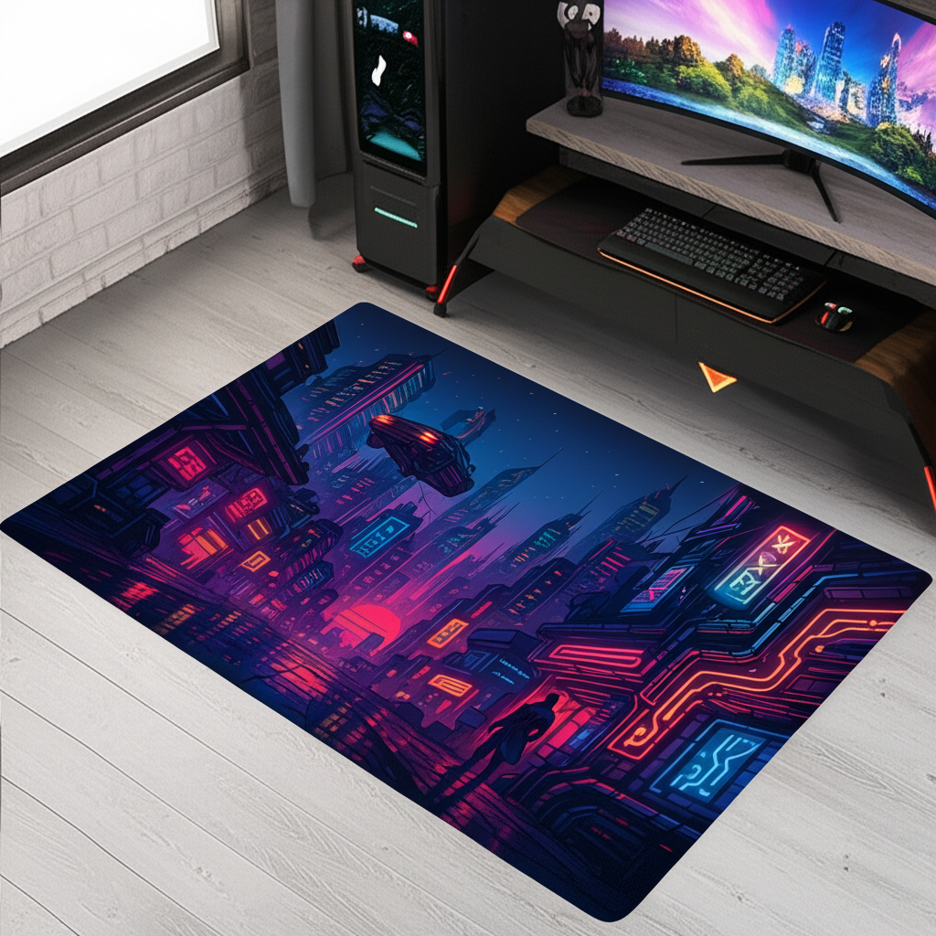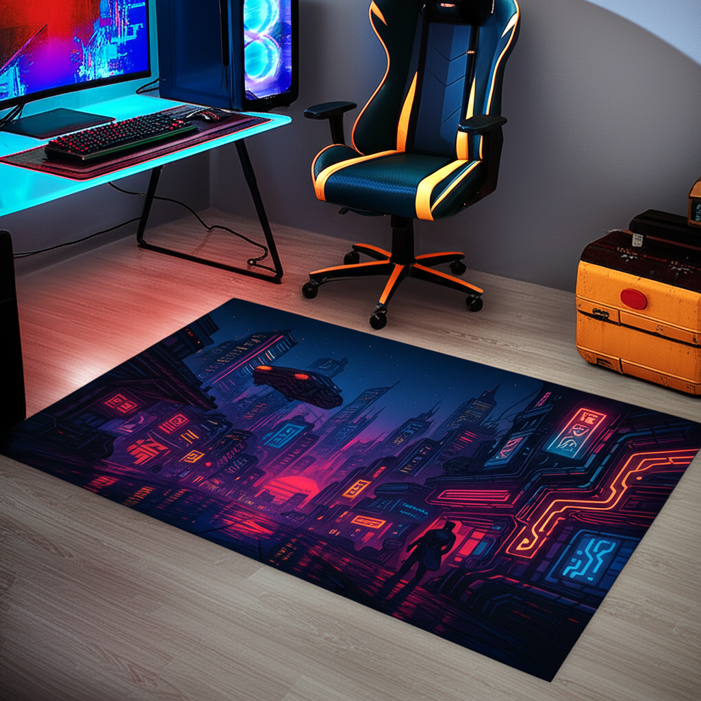 Elevate your gaming setup or living space with this stunning Cyberpunk World Rug! Featuring a vibrant, digitally printed high-resolution design, it brings the futuristic allure of a neon-lit cityscape right to your floor. The rug showcases a breathtaking cyberpunk world, complete with towering skyscrapers, flying vehicles, and glowing neon signs, creating an immersive and visually captivating experience.