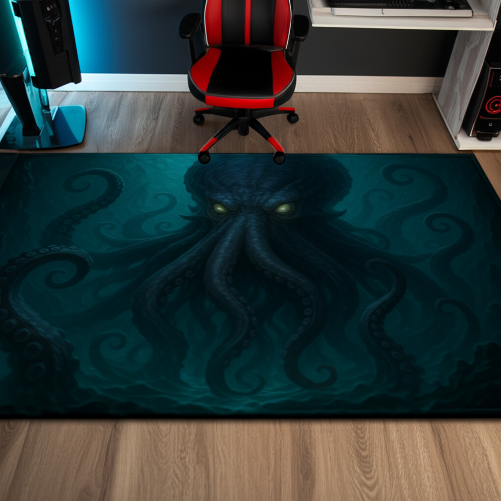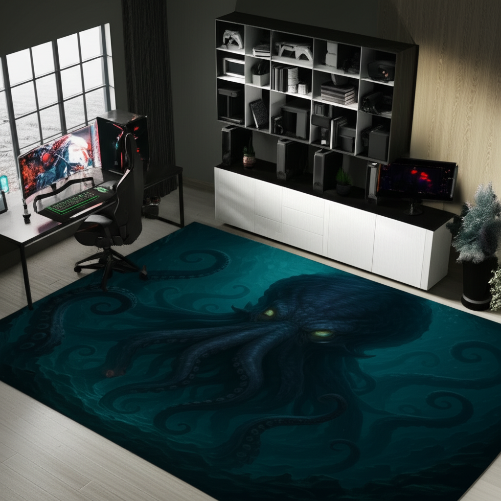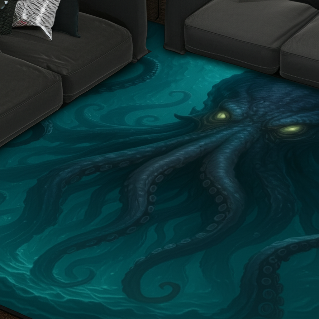 Unleash the mythical power of the deep sea with this mesmerizing Kraken Abyss Rug! This captivating rug features a stunning illustration of a kraken, its tentacles swirling in a dark, mysterious ocean. The intense gaze of the kraken's eyes adds an intriguing focal point, making it a perfect statement piece for any room.