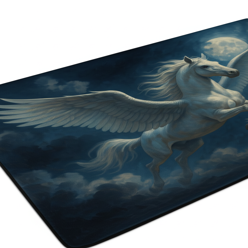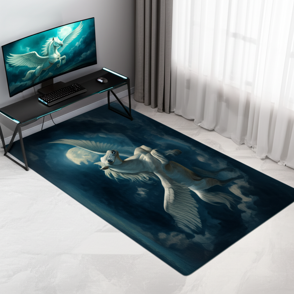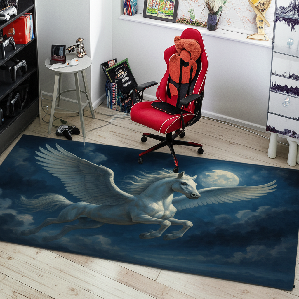 Elevate your living space with this breathtaking Pegasus Flight Premium Rug. Imagine this stunning rug as the centerpiece of your living room, beneath your favorite sofa, instantly adding a touch of mythical charm and artistic flair. The design features a majestic white Pegasus soaring against a night sky with a bright moon, creating a dreamy and inspiring ambiance. Perfect for adding a touch of fantasy to your home decor. This rug is more than just a floor covering; it's a statement piece that reflects your unique taste. It is ideal for anyone who loves fantasy art, mythology, or simply wants to create a captivating and inviting atmosphere in their home. It also makes a thoughtful and unique gift for birthdays, housewarmings, or any special occasion.