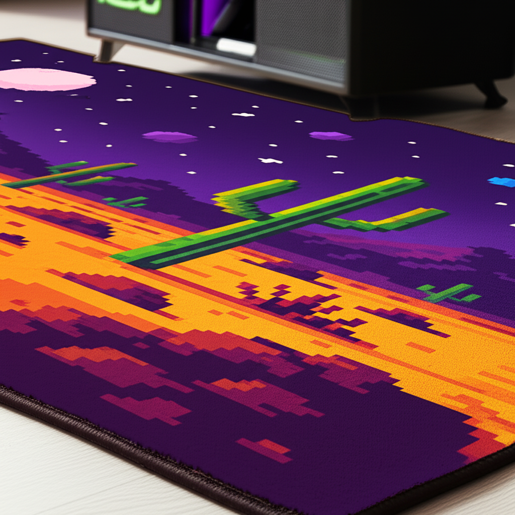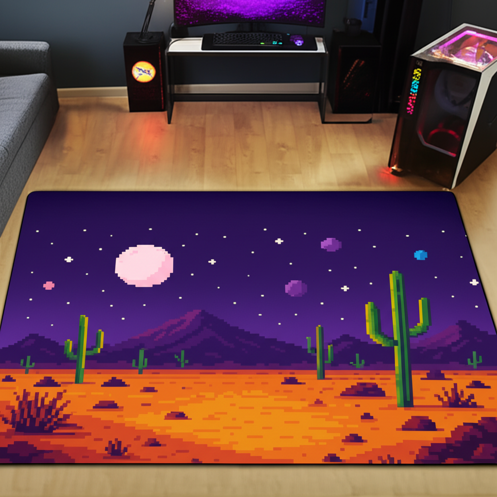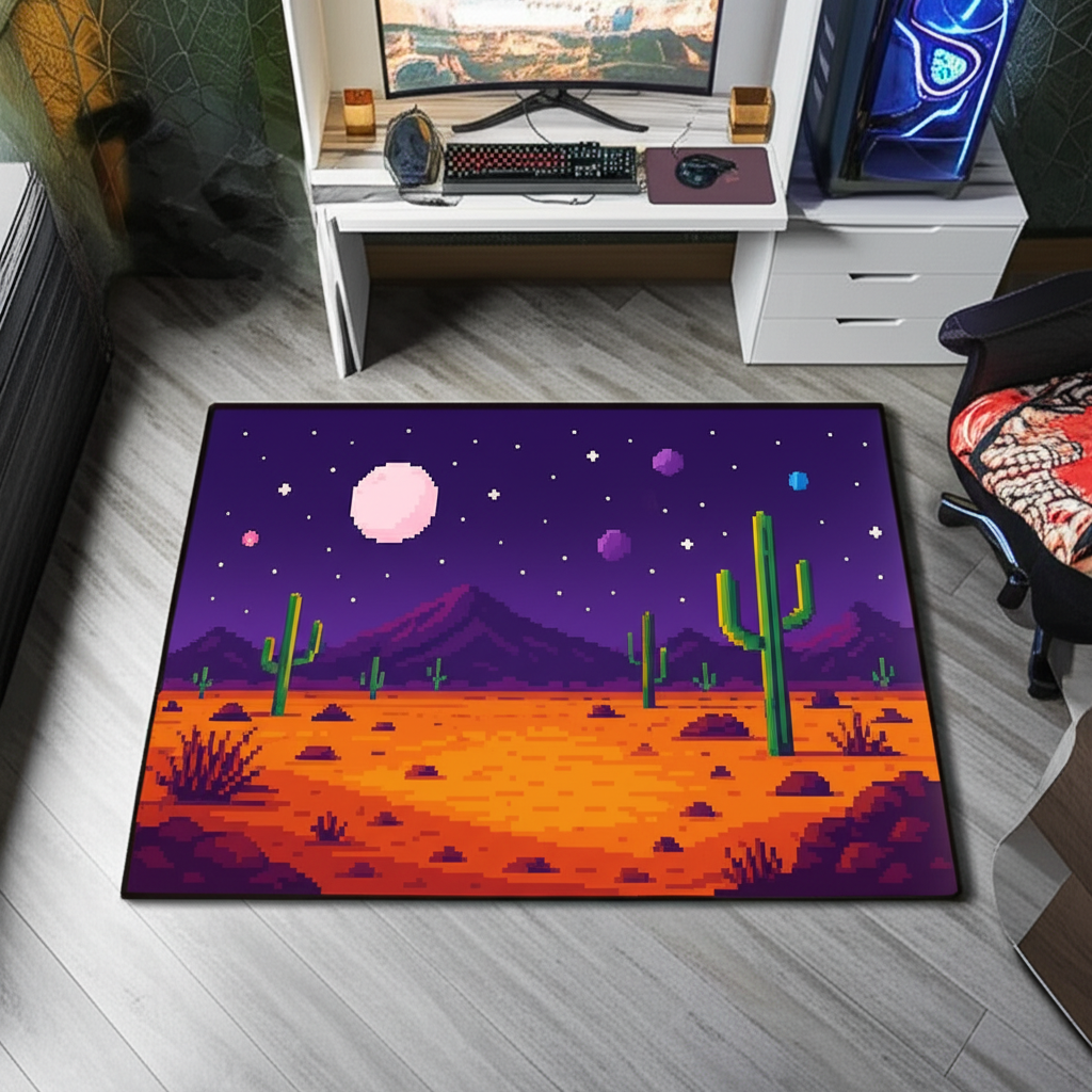 Step into a world of retro charm with this captivating Pixel Deser Rug! Envisioned as the perfect addition to a gaming room or a geek-chic home, this rug transports you to a pixelated desert landscape under a starlit sky. The design features a vibrant orange desert floor dotted with cacti, set against a deep purple night sky with pixelated moon and planets. It’s not just a rug; it’s a statement piece that brings a touch of nostalgia and whimsy to any space.