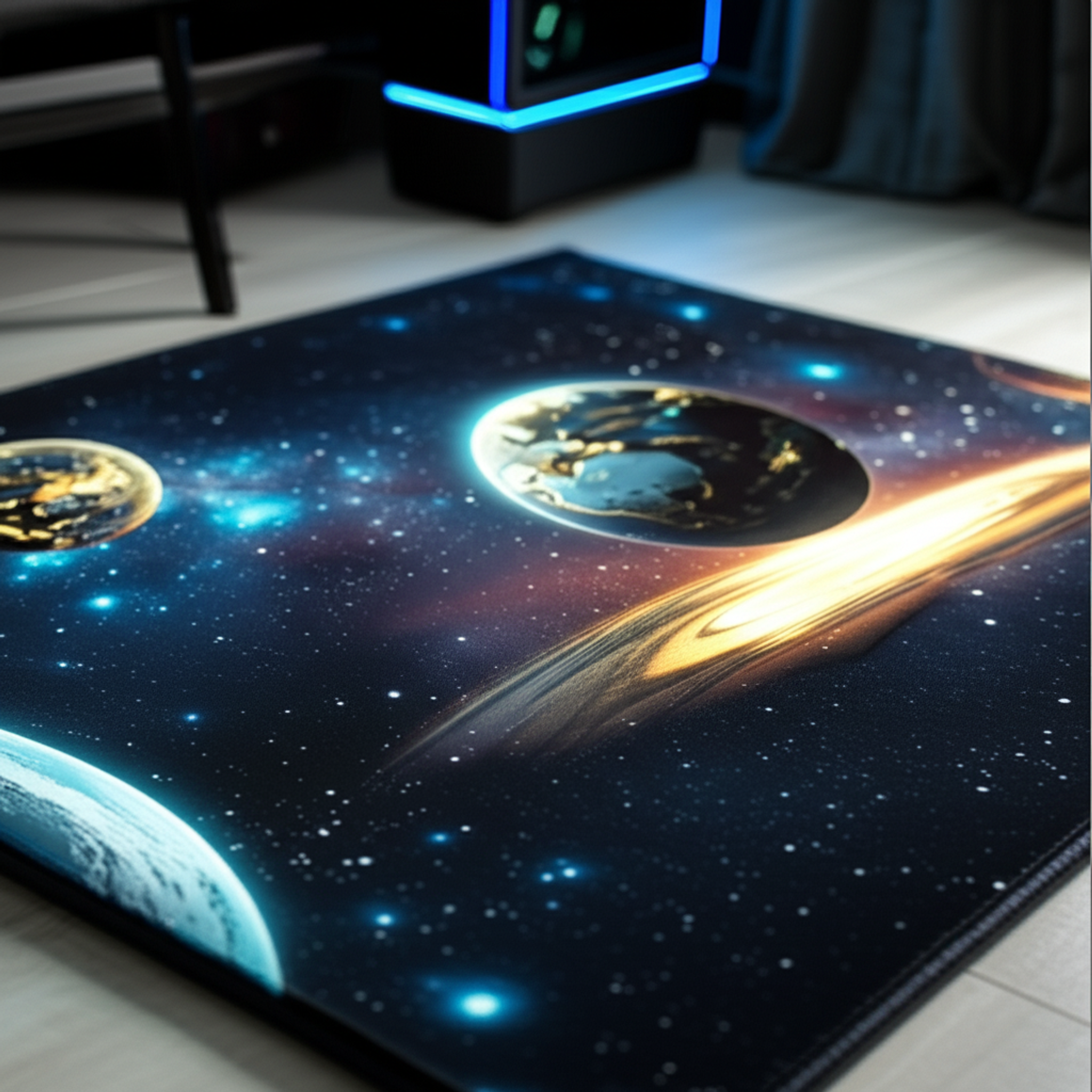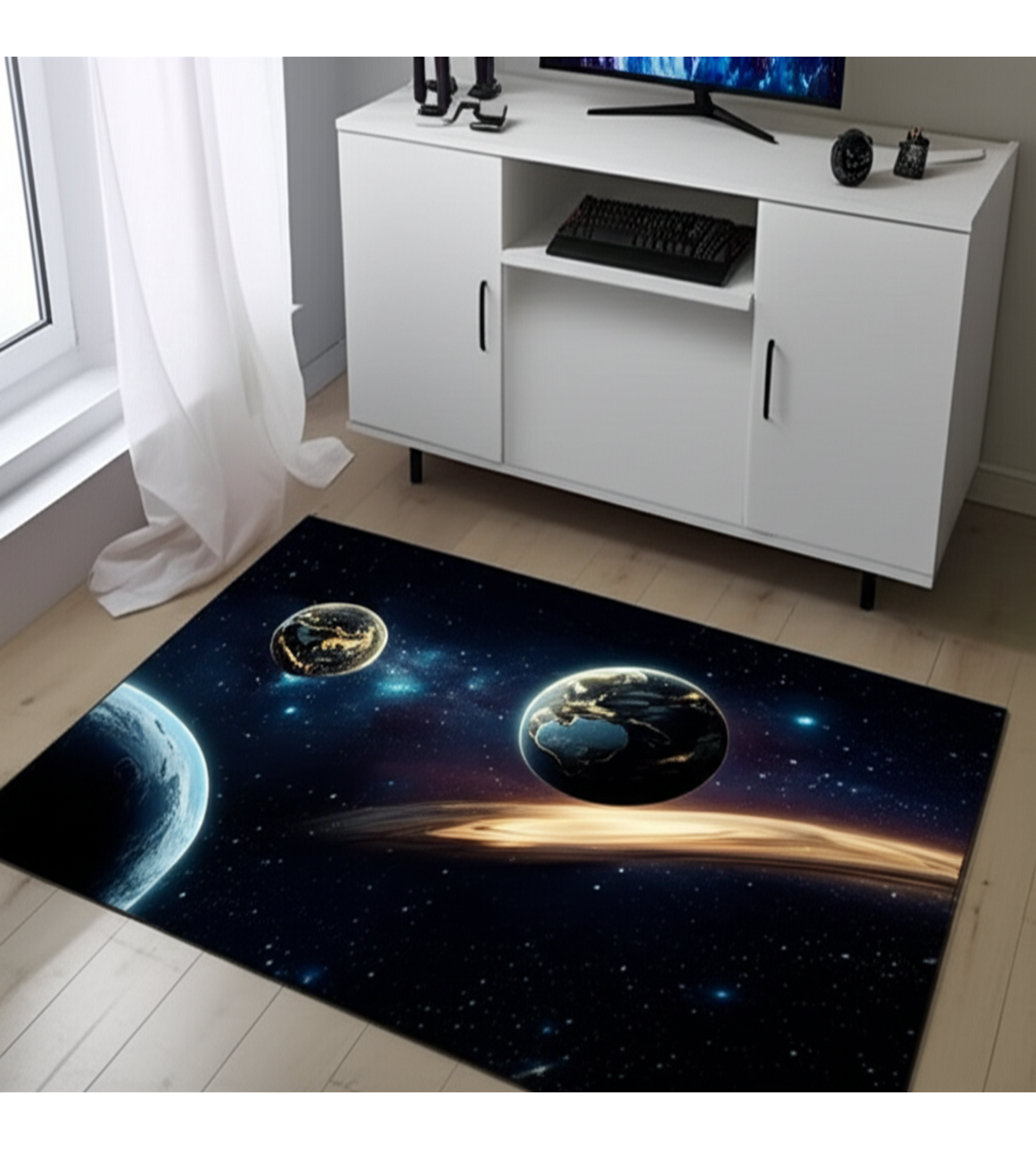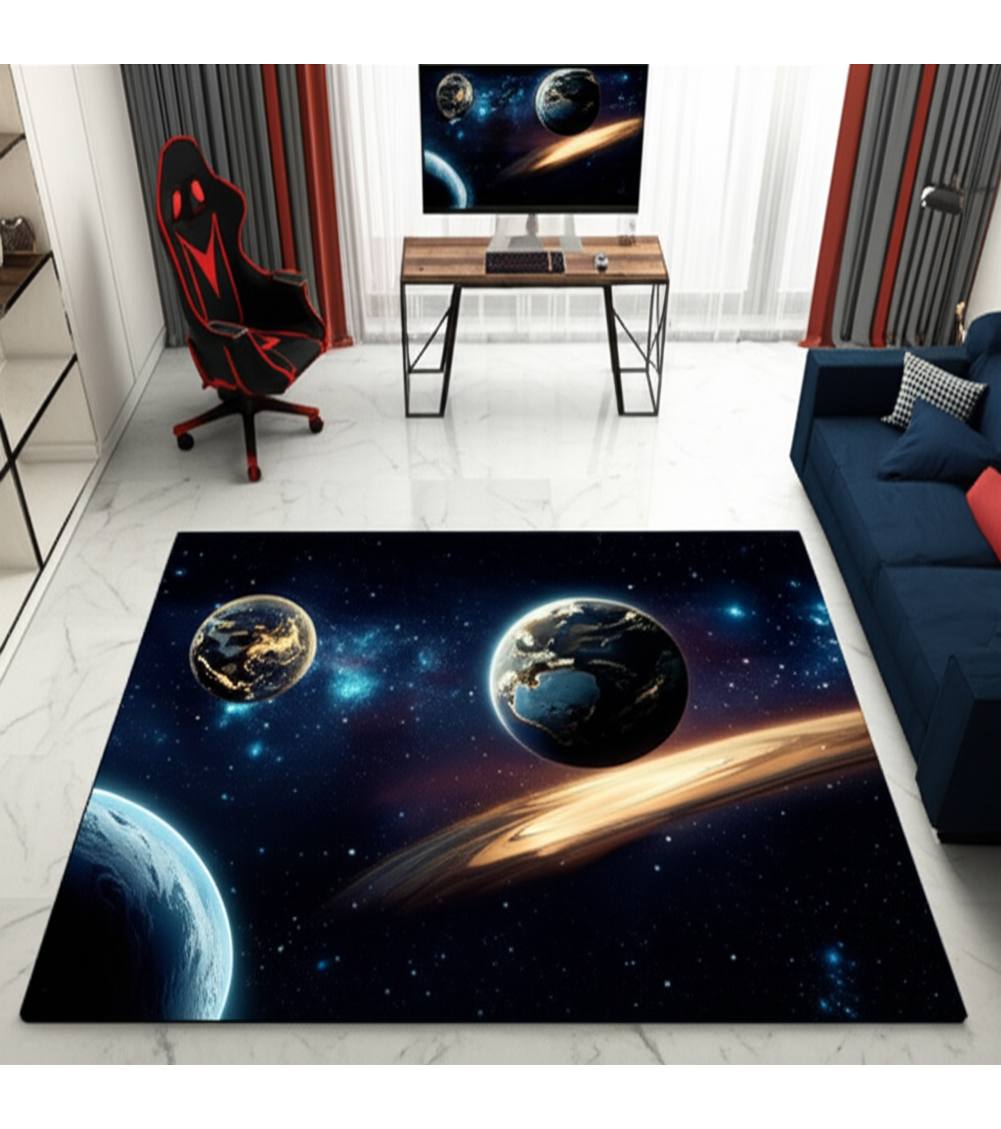 This rug features a vivid design of planets in space. The colors are deep blues, blacks, and golds, creating a galactic effect. The rug would make a unique and stylish statement in any room.
