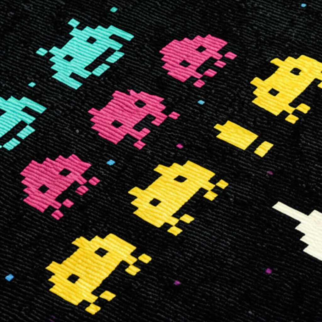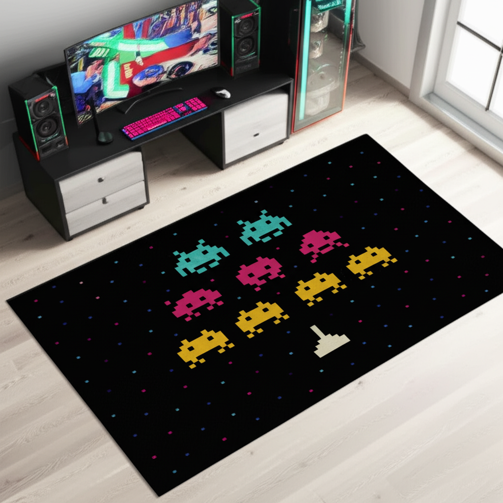 Level up your space with our Retro Space Invaders Premium Rug! This rug brings a touch of nostalgic fun to any room, featuring a pixelated design reminiscent of classic arcade games. Perfect for gaming rooms, home offices, or kids' bedrooms, this rug adds a playful and vibrant element to your decor.