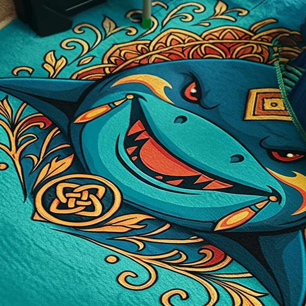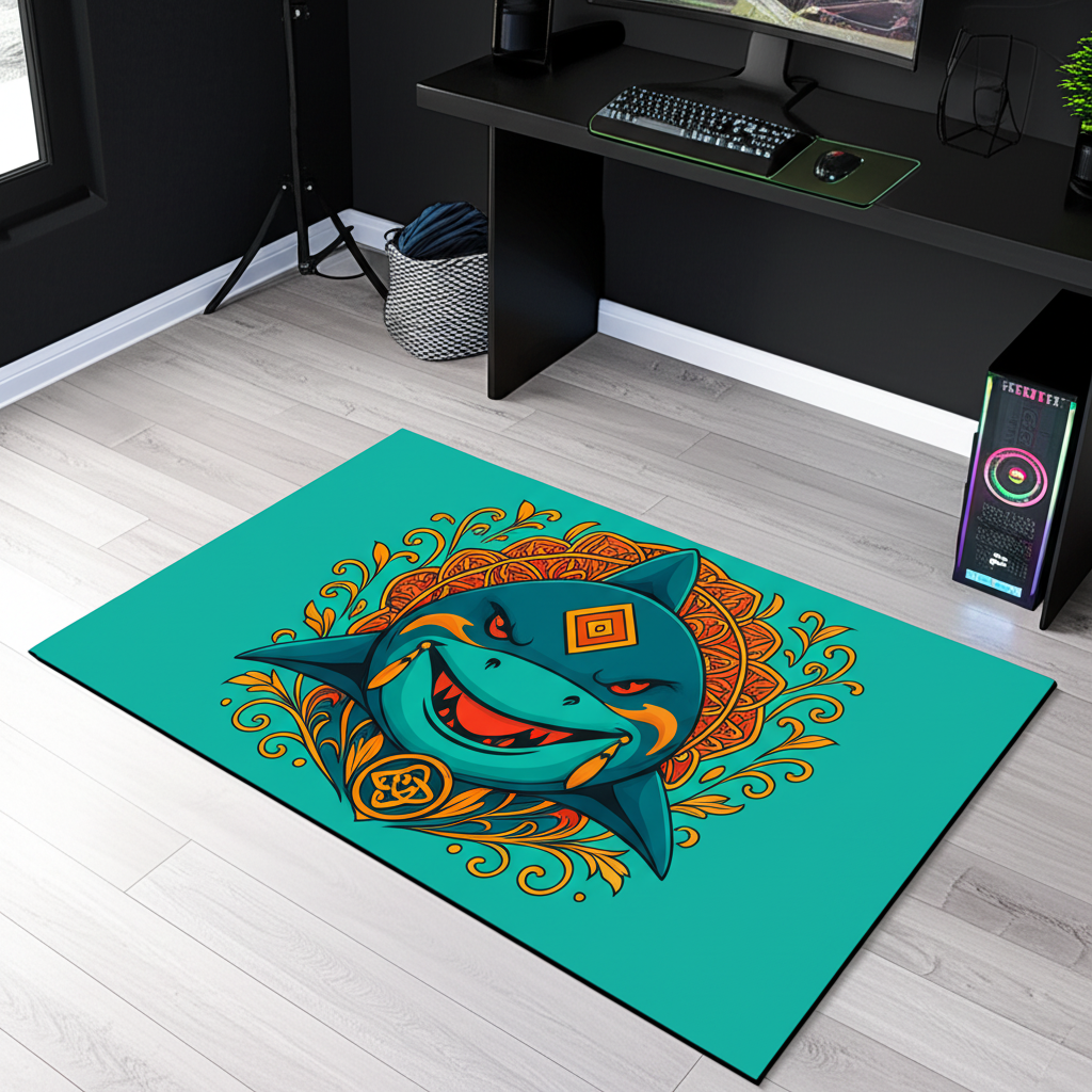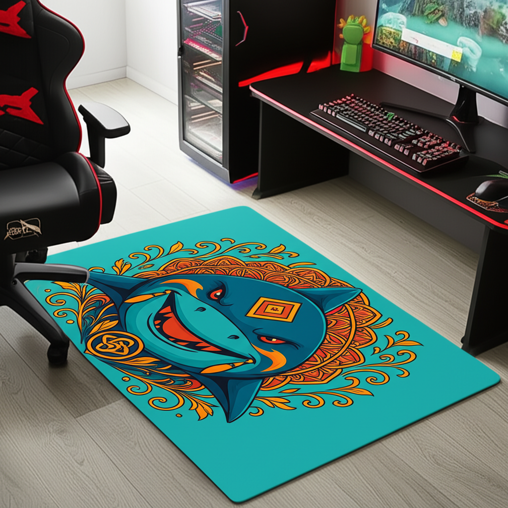 This rug features a cool shark mandala design. The playful colors in blue and orange make it a vibrant addition to any room. The intricate ornamental details add visual interest and charm.