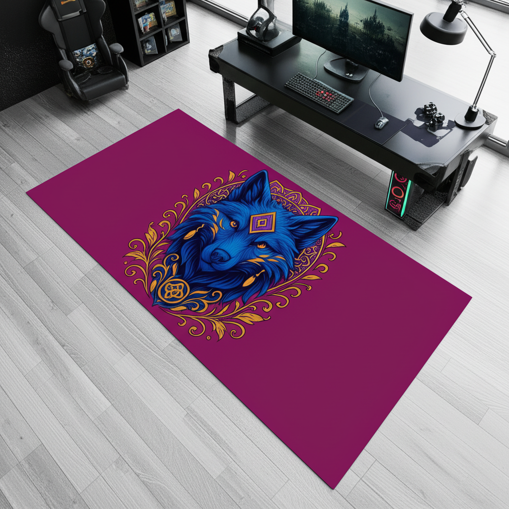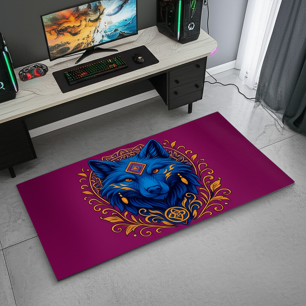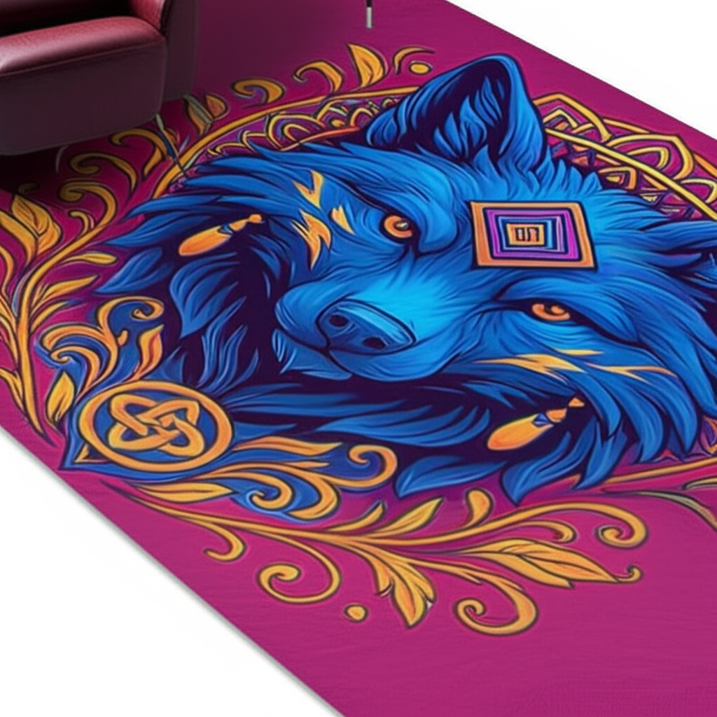 This beautiful rug features a majestic wolf design with an ornate yellow and purple frame. The rich colors and intricate details add a touch of elegance and mystique to any room. It will surely create a captivating focal point.